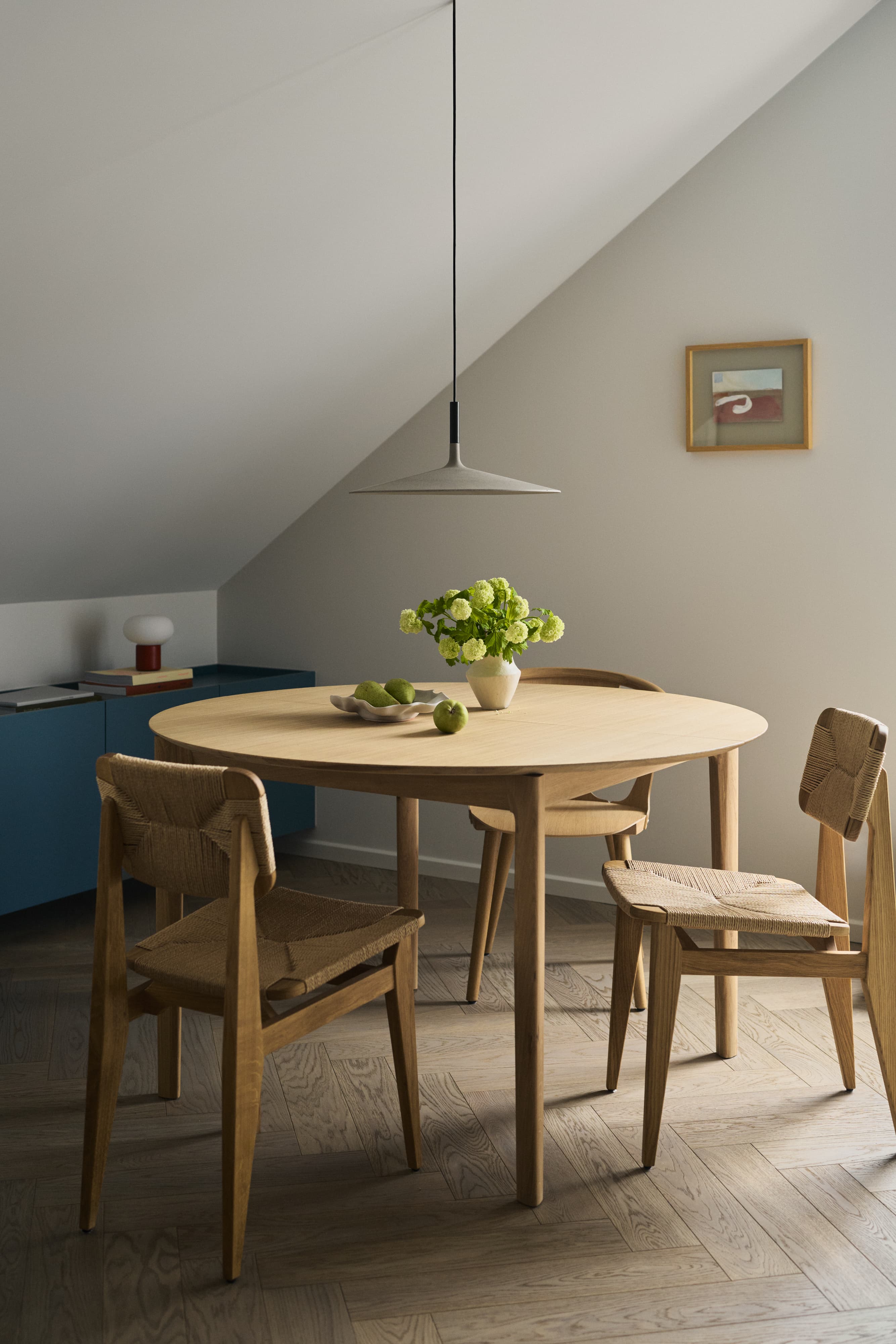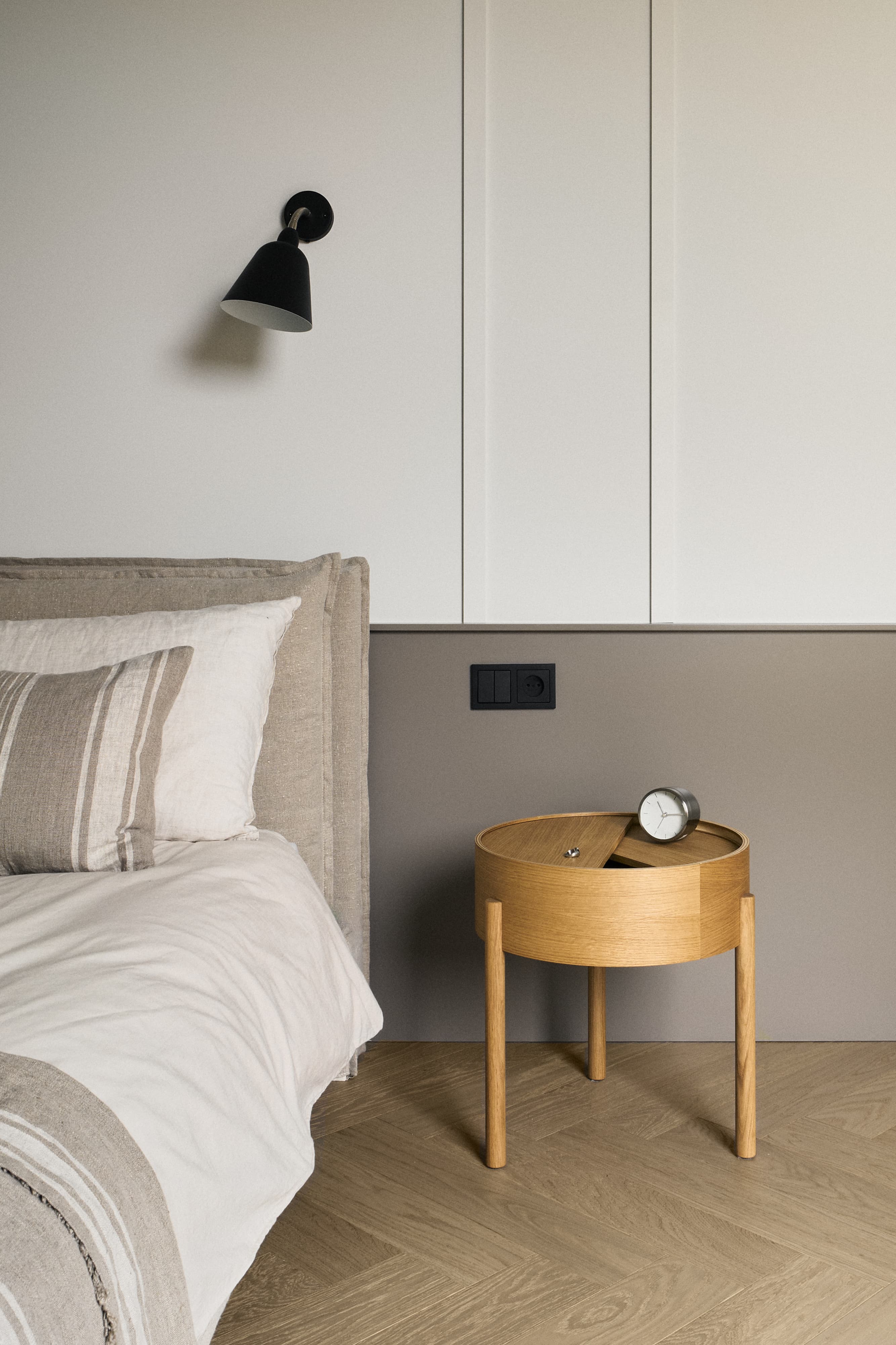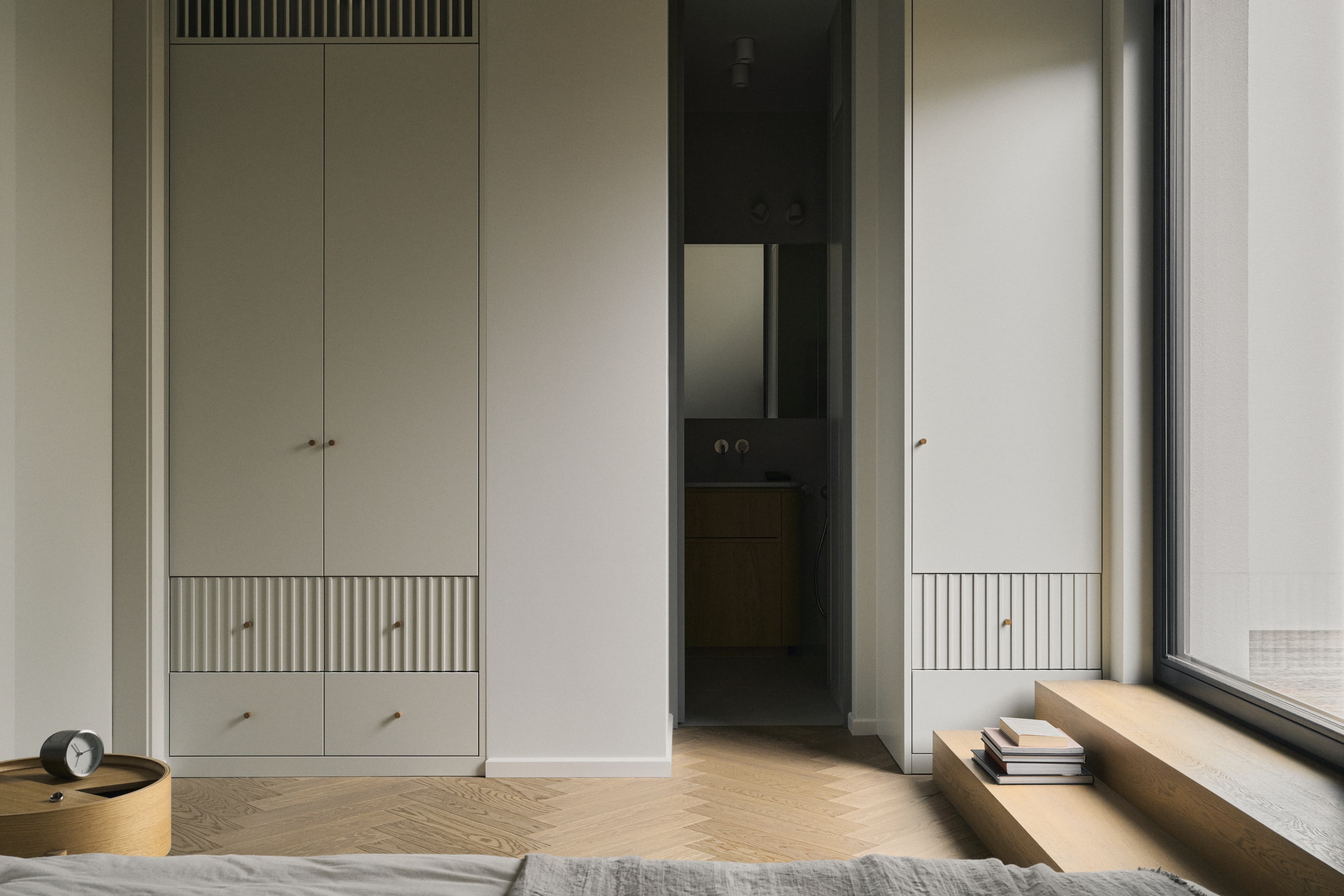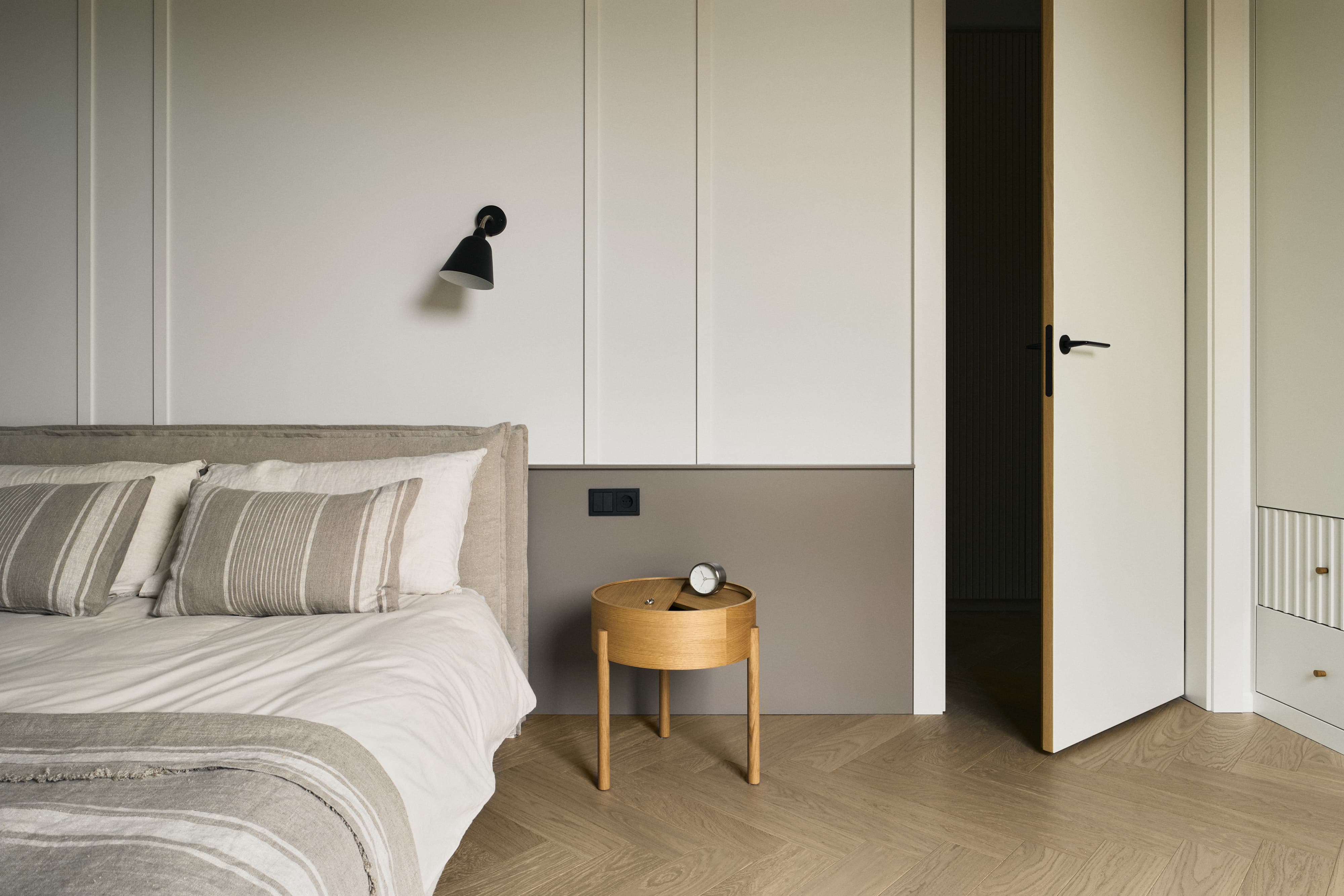 Wnętrze jest utrzymane w bardzo monochromatycznej gamie. Prostotę podkreślają starannie dobrane meble. Krzesła Gubi z plecionym siedziskiem czy minimalistyczna lampa Foscarini nad stołem. Wszystkie wykorzystane materiały i okładziny są naturalne, matowe i skromne w wyrazie. Całość stanowi niezwykle spójną przestrzeń .Głównym i najbardziej reprezentacyjnym pomieszczeniem jest salon. Jego atutem jest sporych rozmiarów okno. To dzięki niemu nawet w pochmurny dzień, a tych na Pomorzu zwłaszcza jesienią nie brakuje, pozostaje całkiem dobrze doświetlony. Podobnie jak i łącząca się z nim kuchnia, z której można wyjść na całkiem duży taras z widokiem. Są tu też dwie sypialnie i dwie łazienki.
