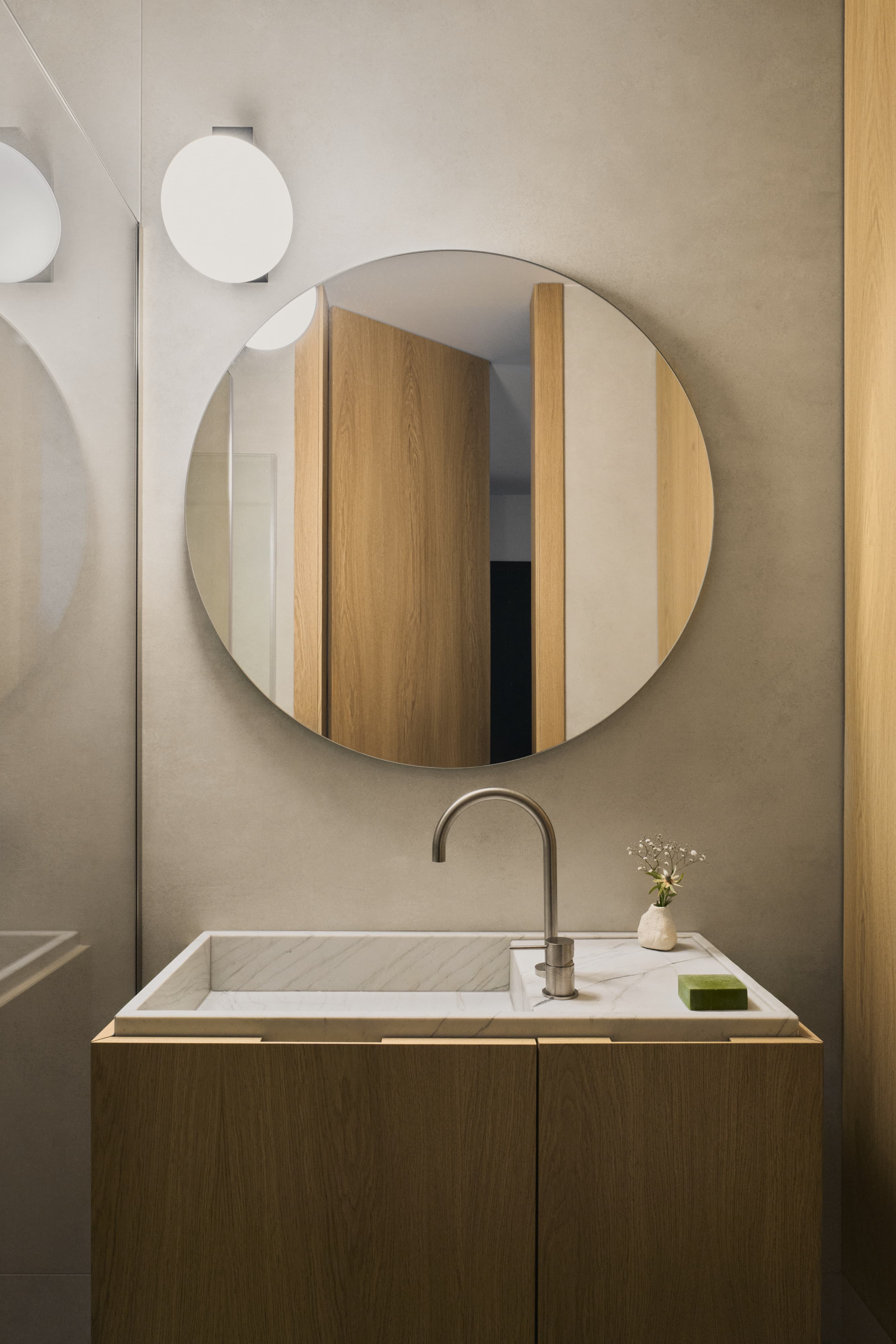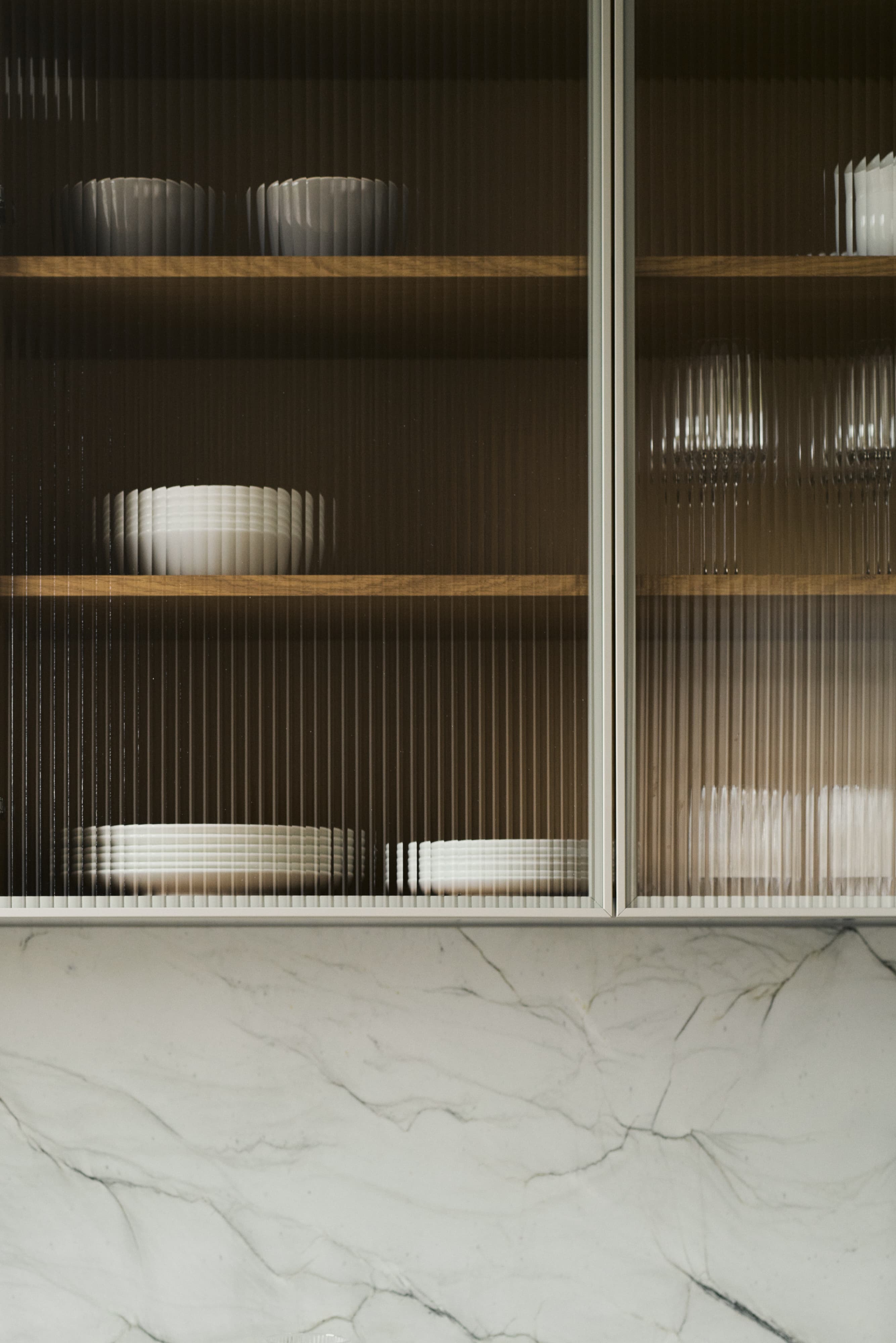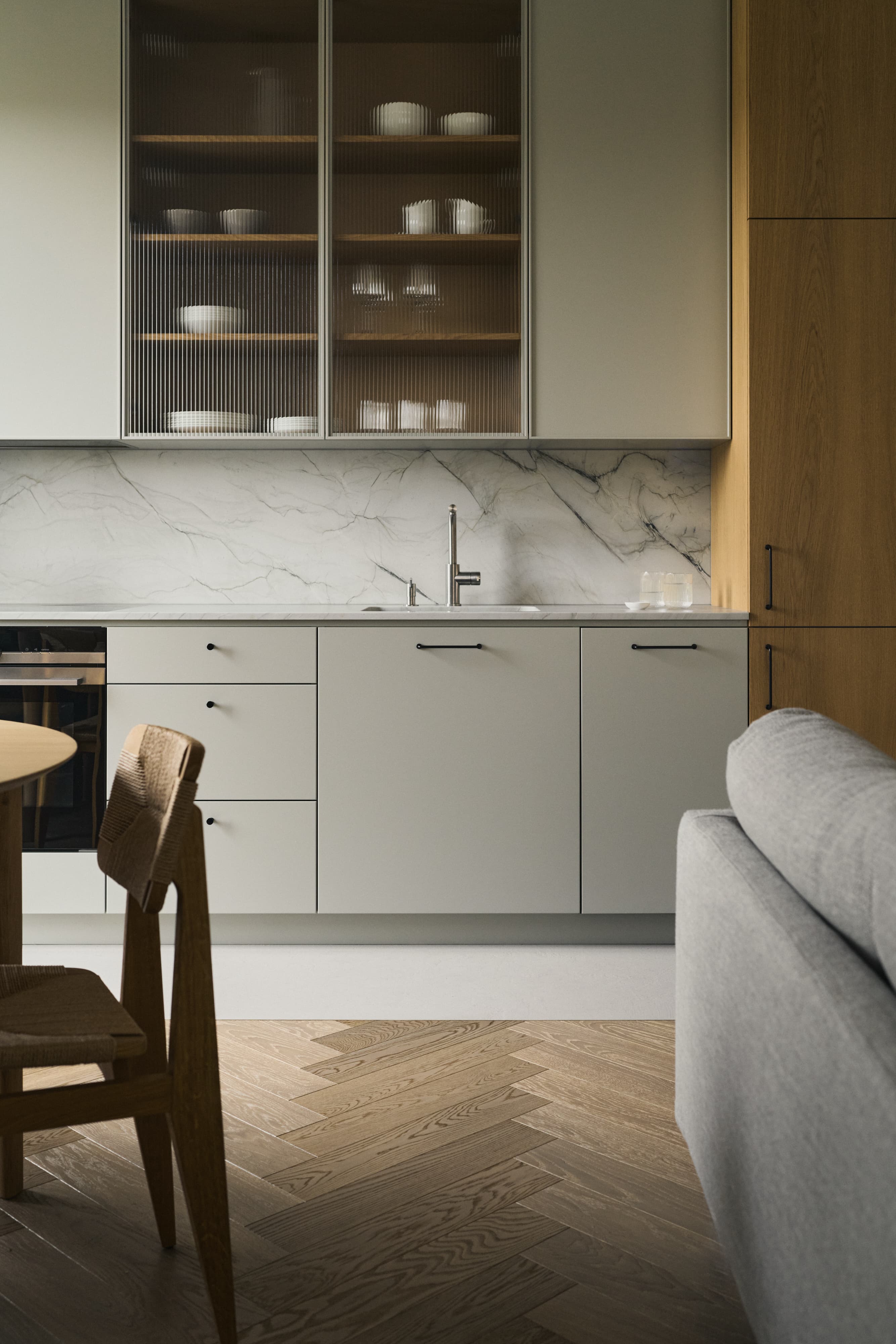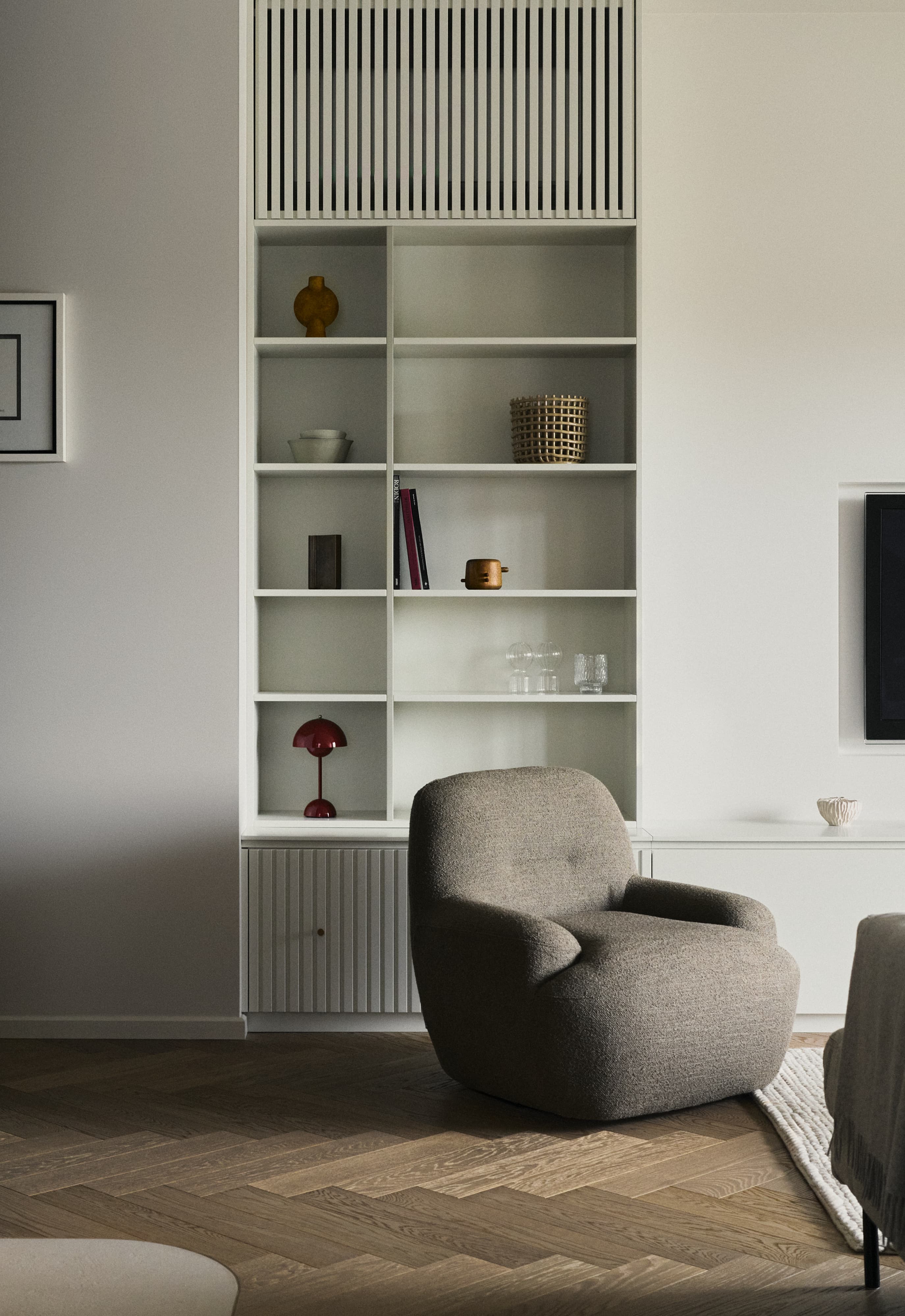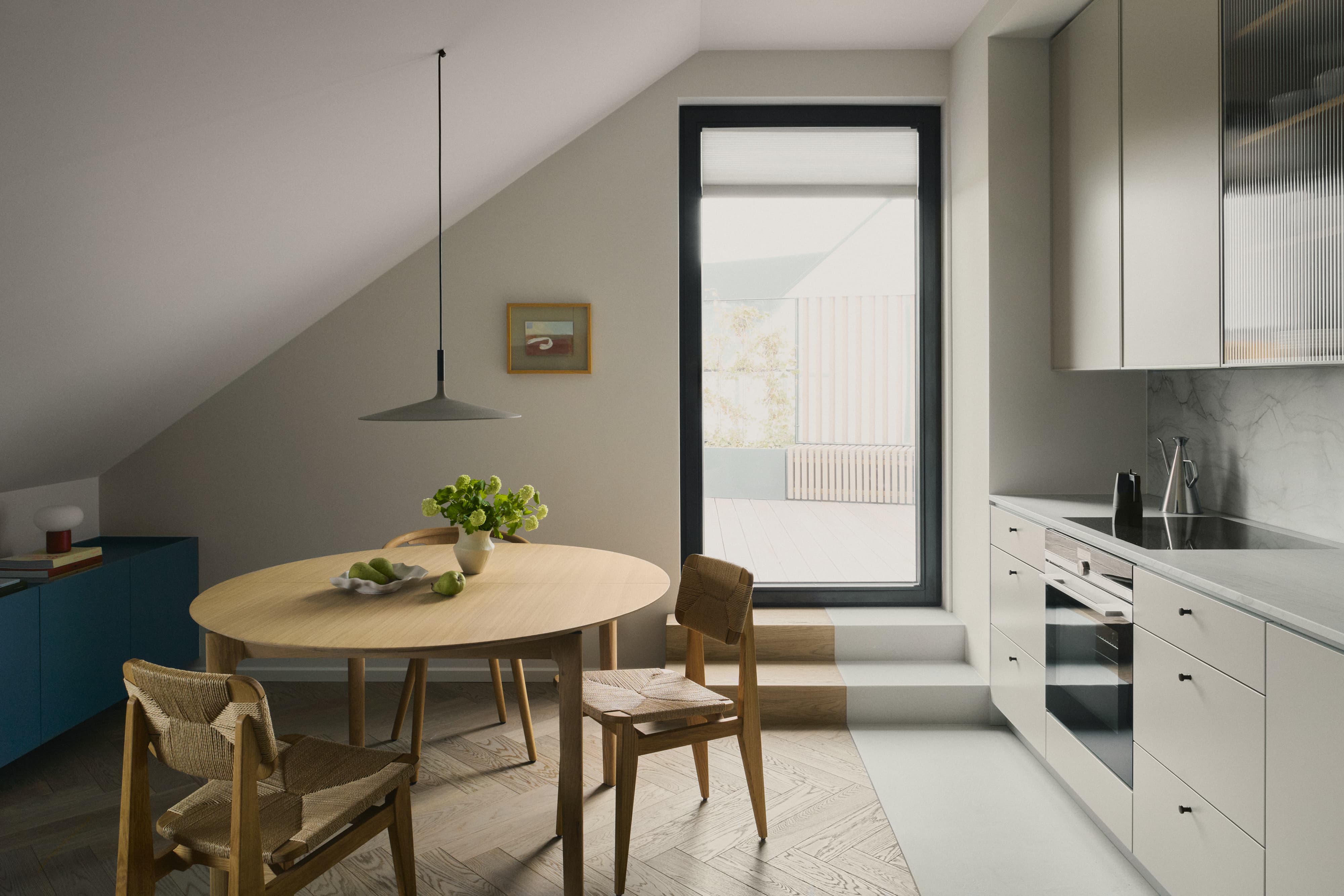 Wnętrze jest utrzymane w bardzo monochromatycznej gamie. Prostotę podkreślają starannie dobrane meble. Krzesła Gubi z plecionym siedziskiem czy minimalistyczna lampa Foscarini nad stołem. Wszystkie wykorzystane materiały i okładziny są naturalne, matowe i skromne w wyrazie. Całość stanowi niezwykle spójną przestrzeń .Głównym i najbardziej reprezentacyjnym pomieszczeniem jest salon. Jego atutem jest sporych rozmiarów okno. To dzięki niemu nawet w pochmurny dzień, a tych na Pomorzu zwłaszcza jesienią nie brakuje, pozostaje całkiem dobrze doświetlony. Podobnie jak i łącząca się z nim kuchnia, z której można wyjść na całkiem duży taras z widokiem. Są tu też dwie sypialnie i dwie łazienki.