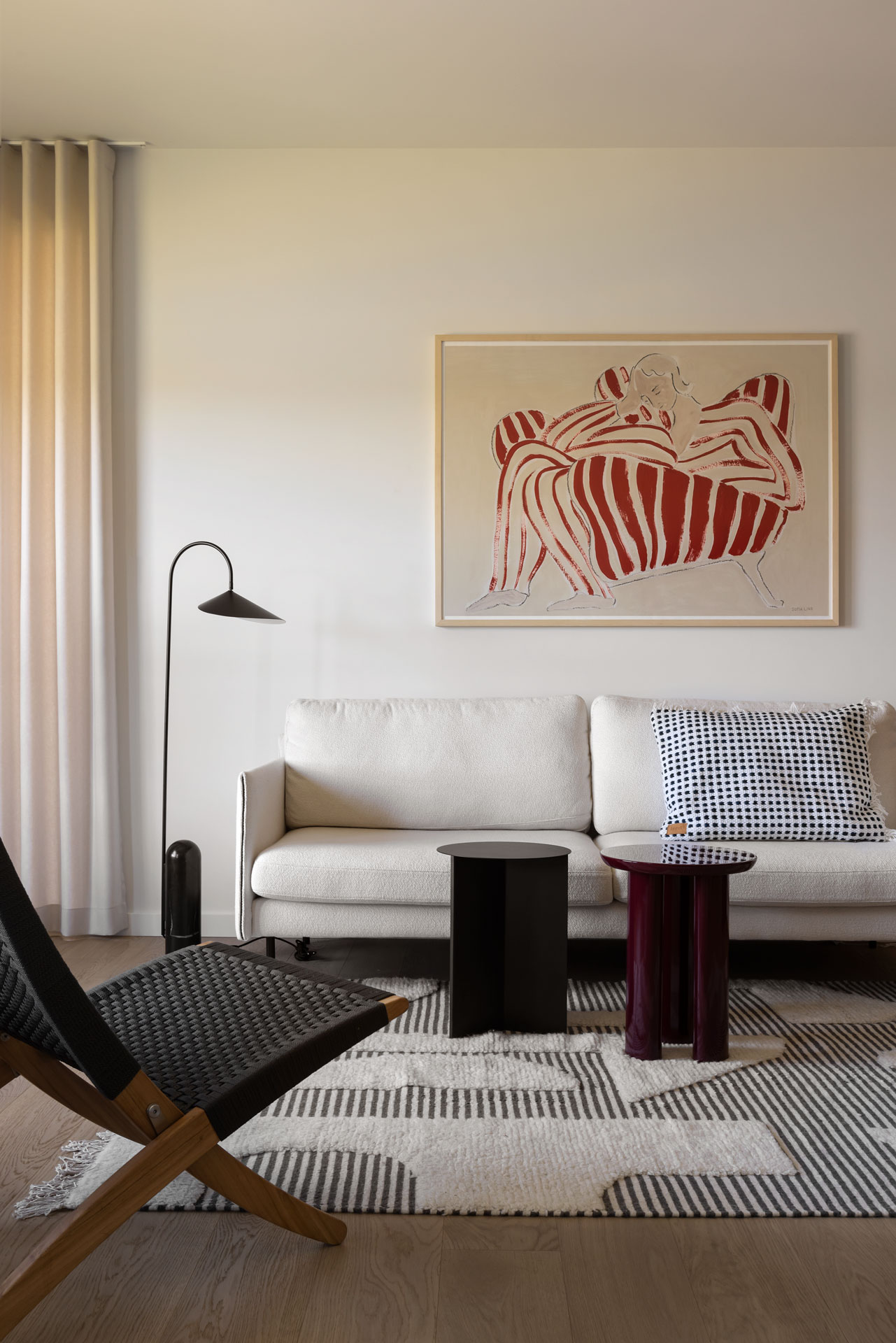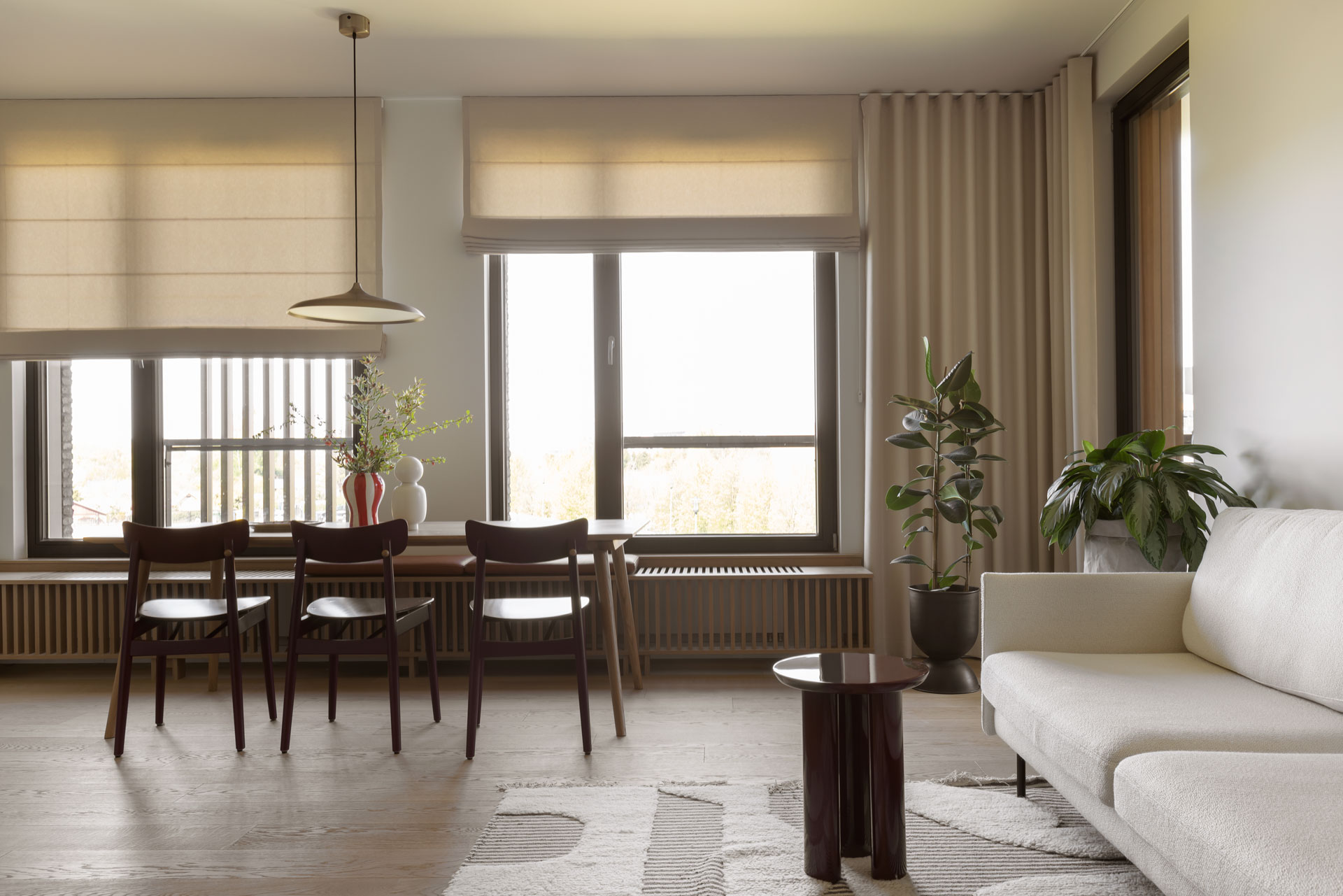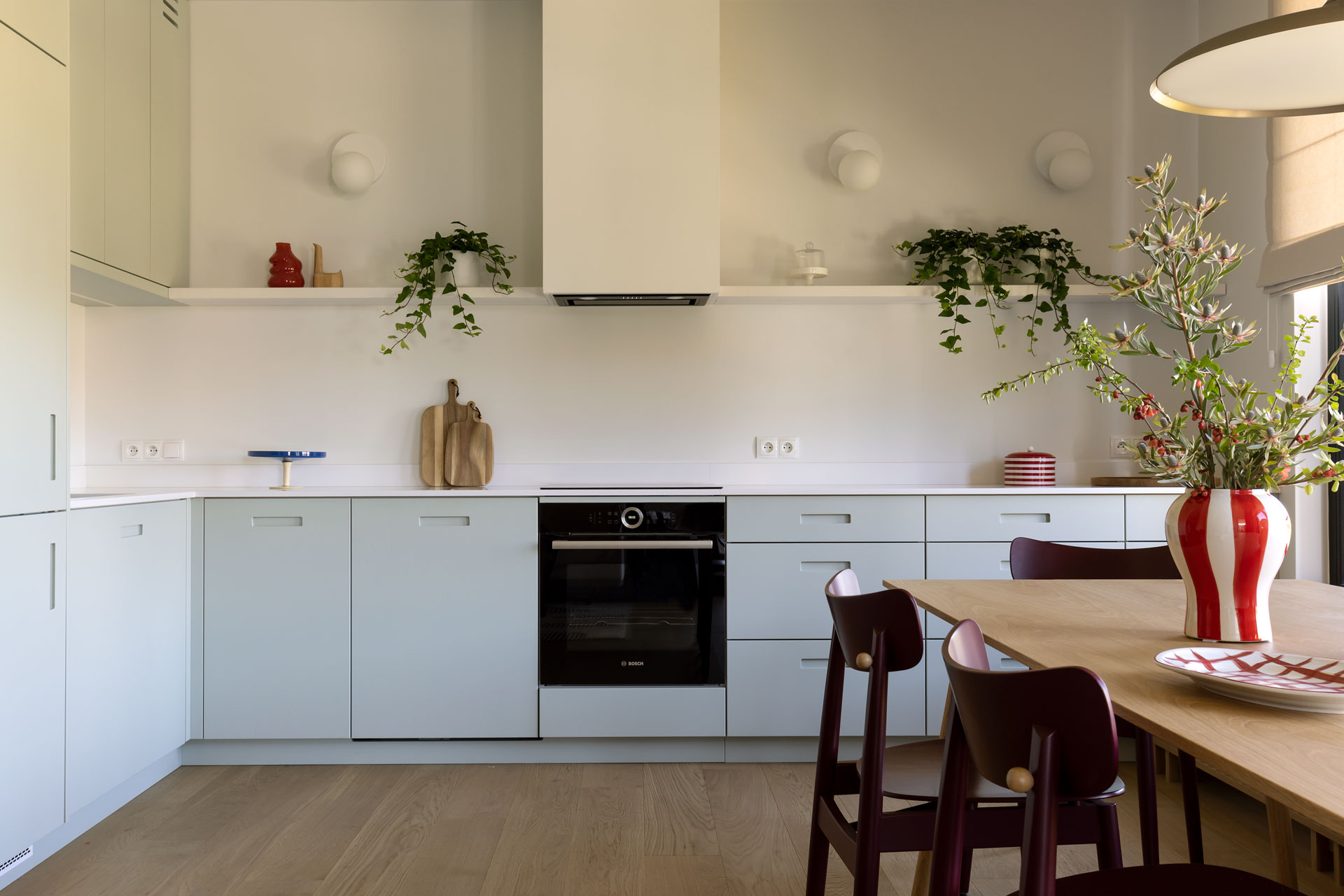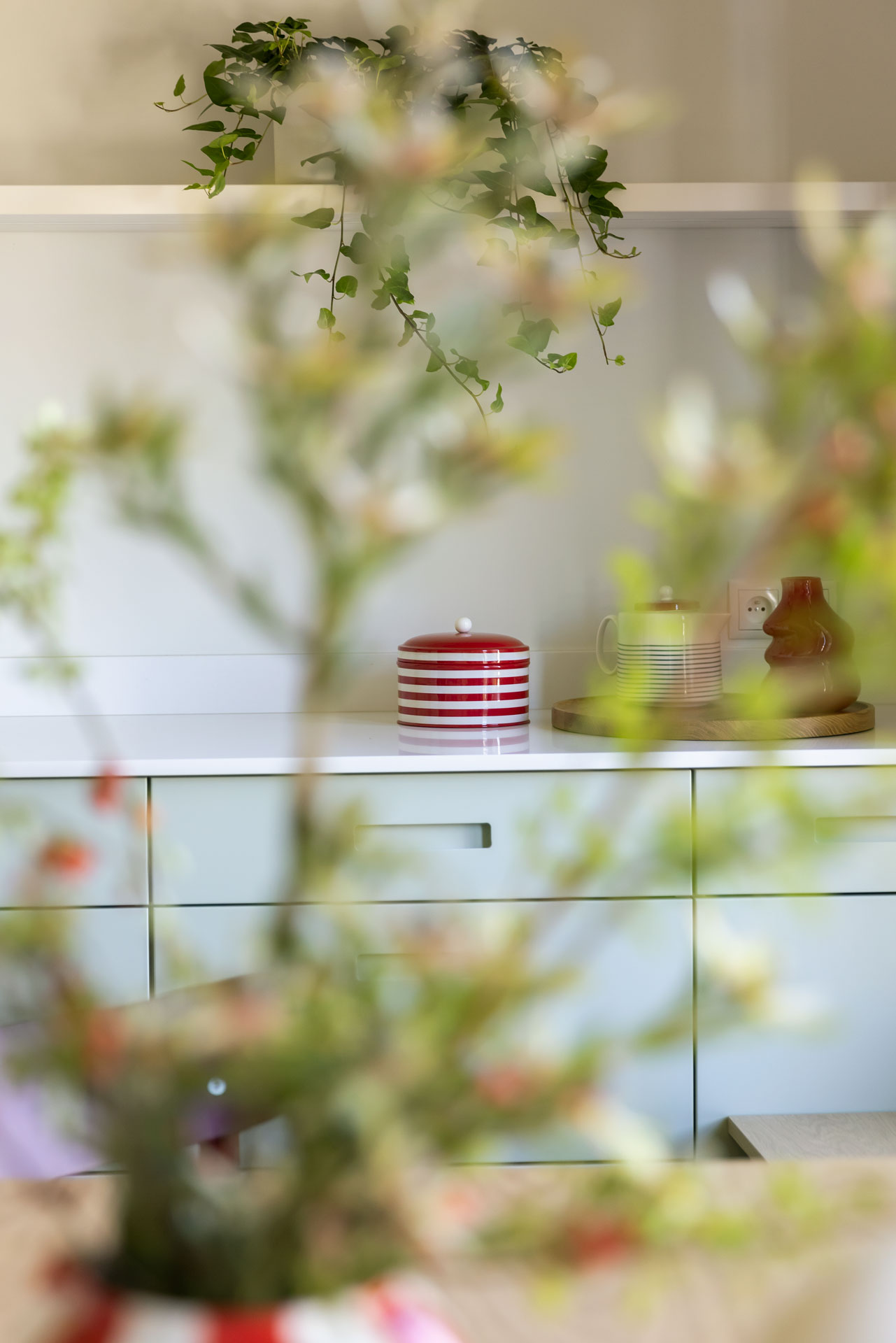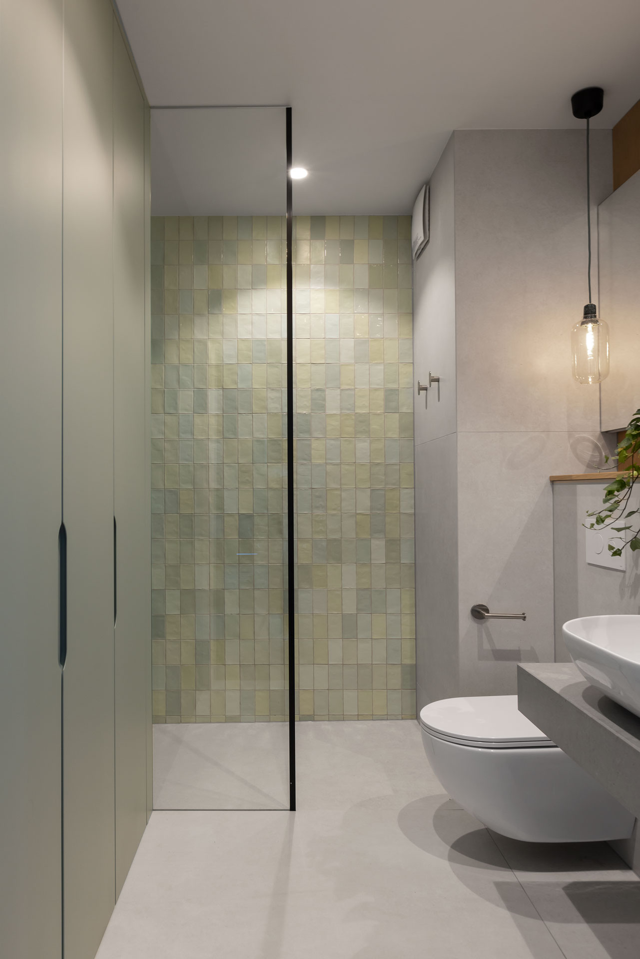 Apartament w Sopocie położony jest tuż przy plaży, a okolica tonie w zieleni. Właściciele, którzy na co dzień mieszkają za oceanem, nie mogli się oprzeć tej lokalizacji. Dzisiaj przyjeżdżają tu aby odpocząć. Ale nie tylko. Jest to miejsce licznych rodzinnych spotkań. Stąd naturalny podział przestrzeni na dwie strefy gościnną i prywatną. Część wspólna jest jasna , główną rolę gra widok za oknem. I to właśnie tutaj jest stół – punkt wszystkich spotkań. Tło dla mocnych kolorystycznych akcentów stanowi jasna zieleń. Łazienka gościnna jest utrzymana w tej samej tonacji.