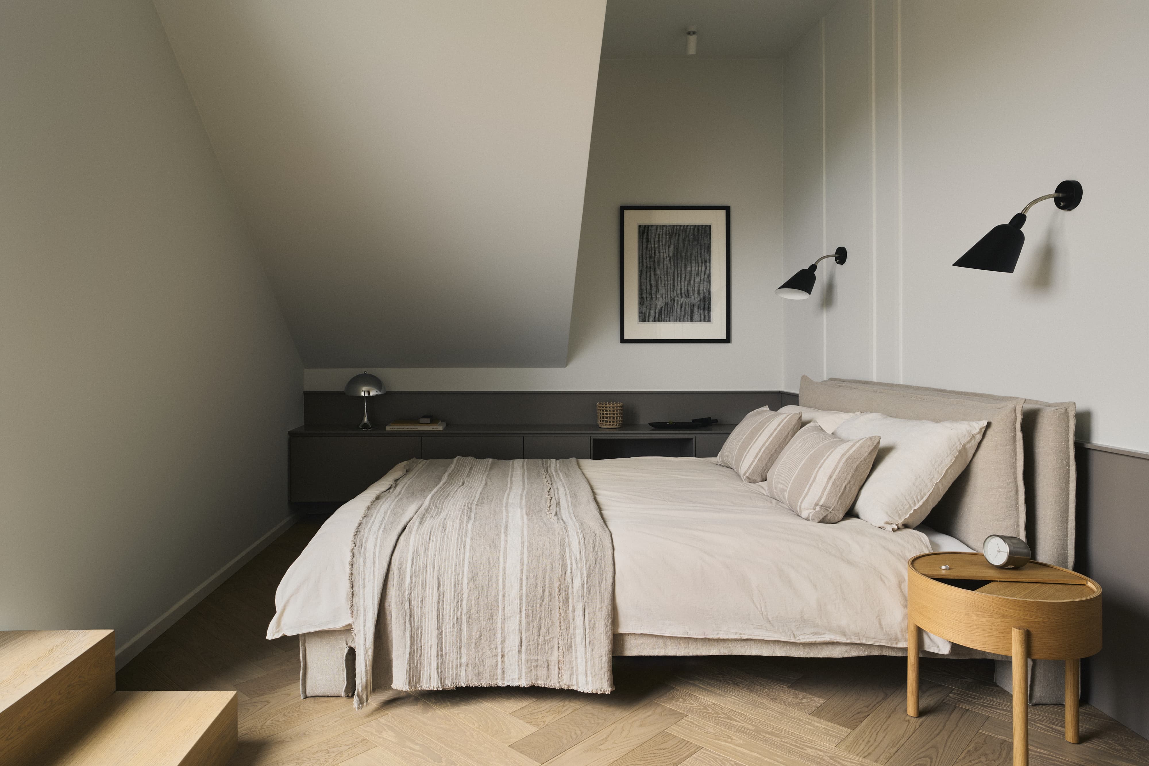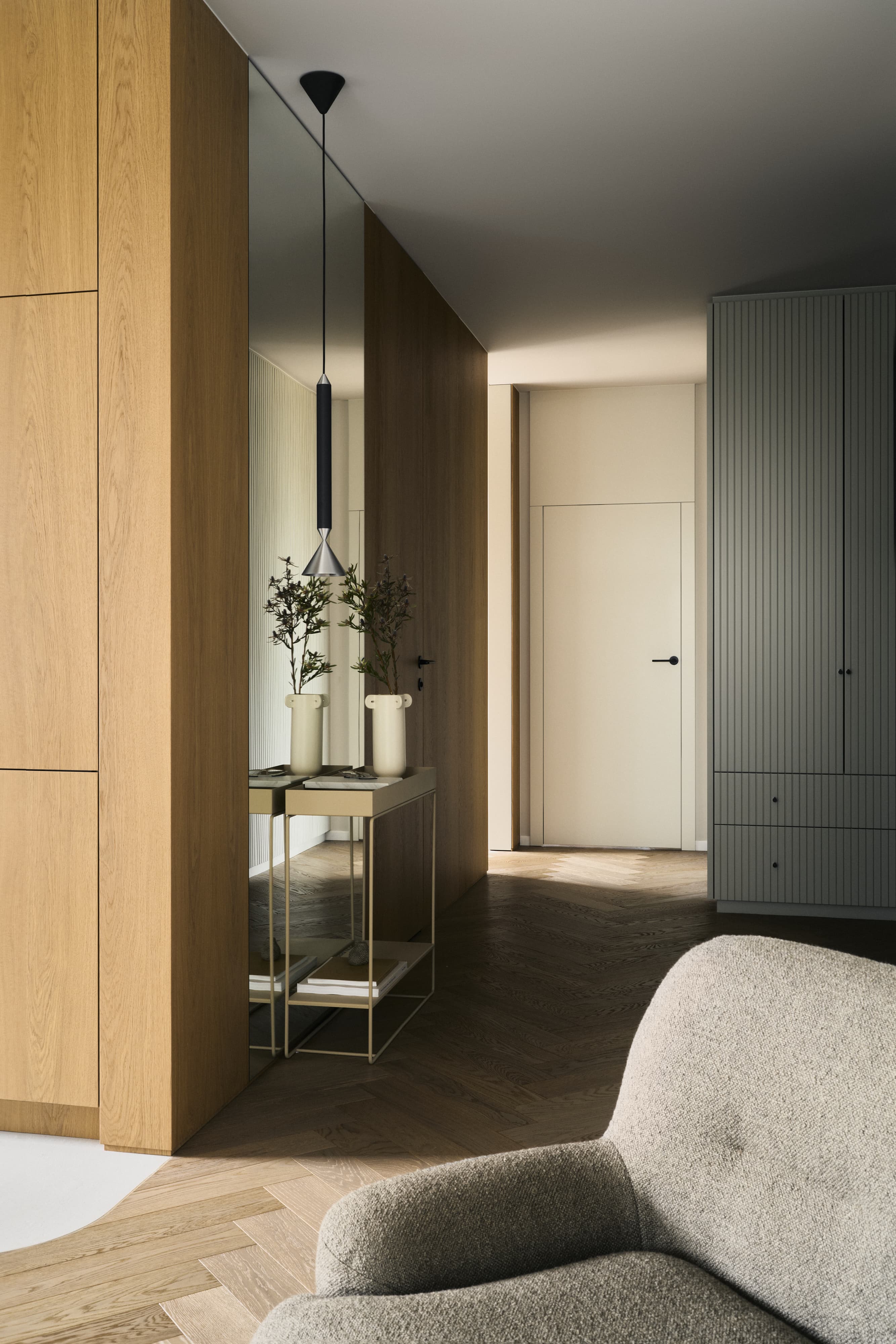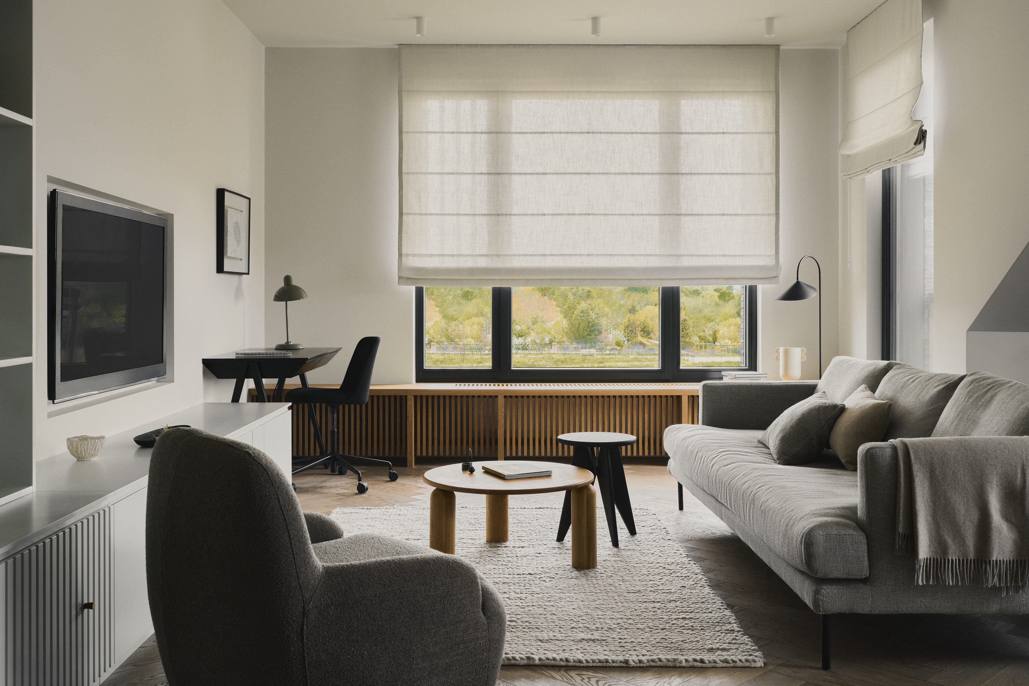 Wnętrze jest utrzymane w bardzo monochromatycznej gamie. Prostotę podkreślają starannie dobrane meble. Krzesła Gubi z plecionym siedziskiem czy minimalistyczna lampa Foscarini nad stołem. Wszystkie wykorzystane materiały i okładziny są naturalne, matowe i skromne w wyrazie. Całość stanowi niezwykle spójną przestrzeń .Głównym i najbardziej reprezentacyjnym pomieszczeniem jest salon. Jego atutem jest sporych rozmiarów okno. To dzięki niemu nawet w pochmurny dzień, a tych na Pomorzu zwłaszcza jesienią nie brakuje, pozostaje całkiem dobrze doświetlony. Podobnie jak i łącząca się z nim kuchnia, z której można wyjść na całkiem duży taras z widokiem. Są tu też dwie sypialnie i dwie łazienki.
