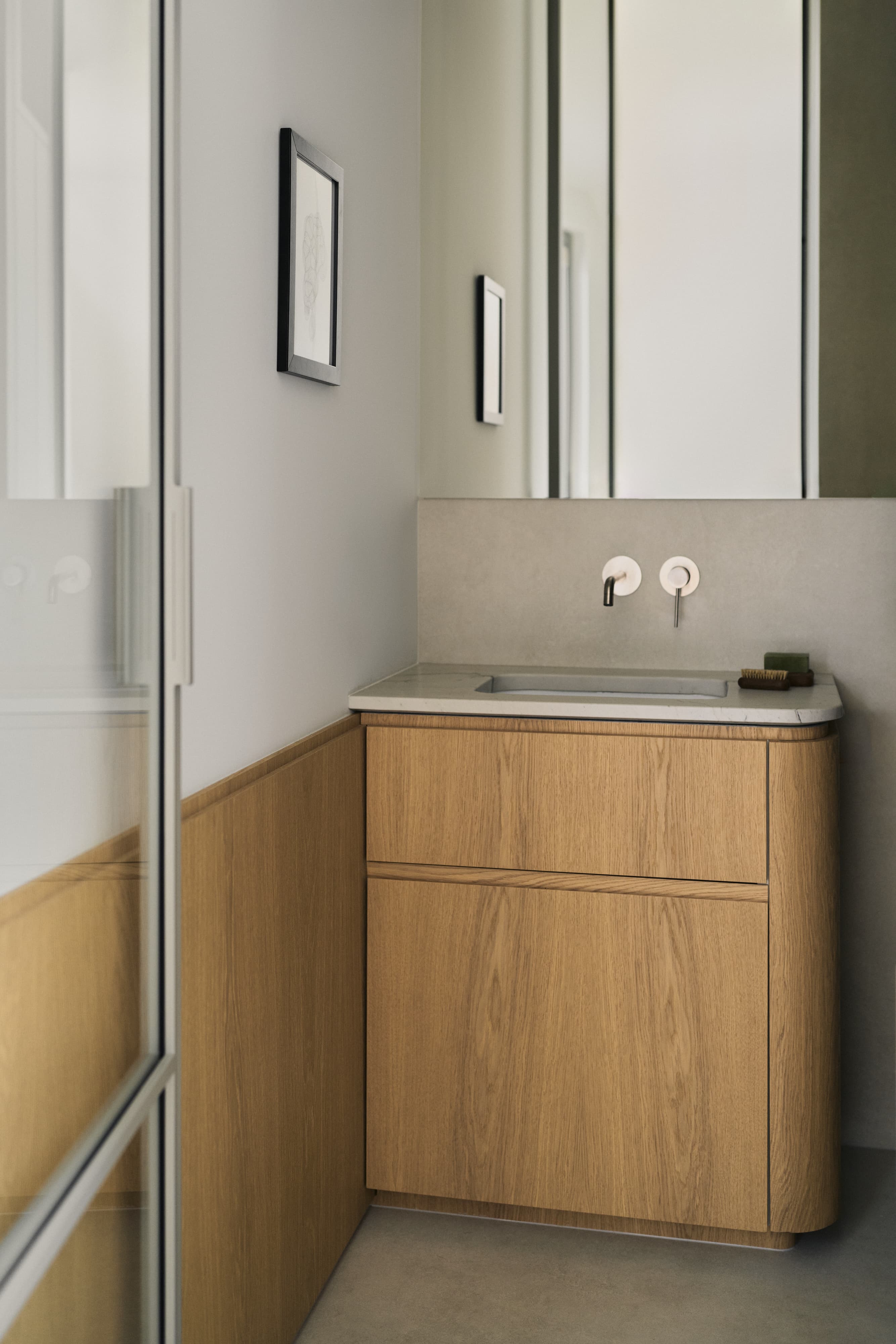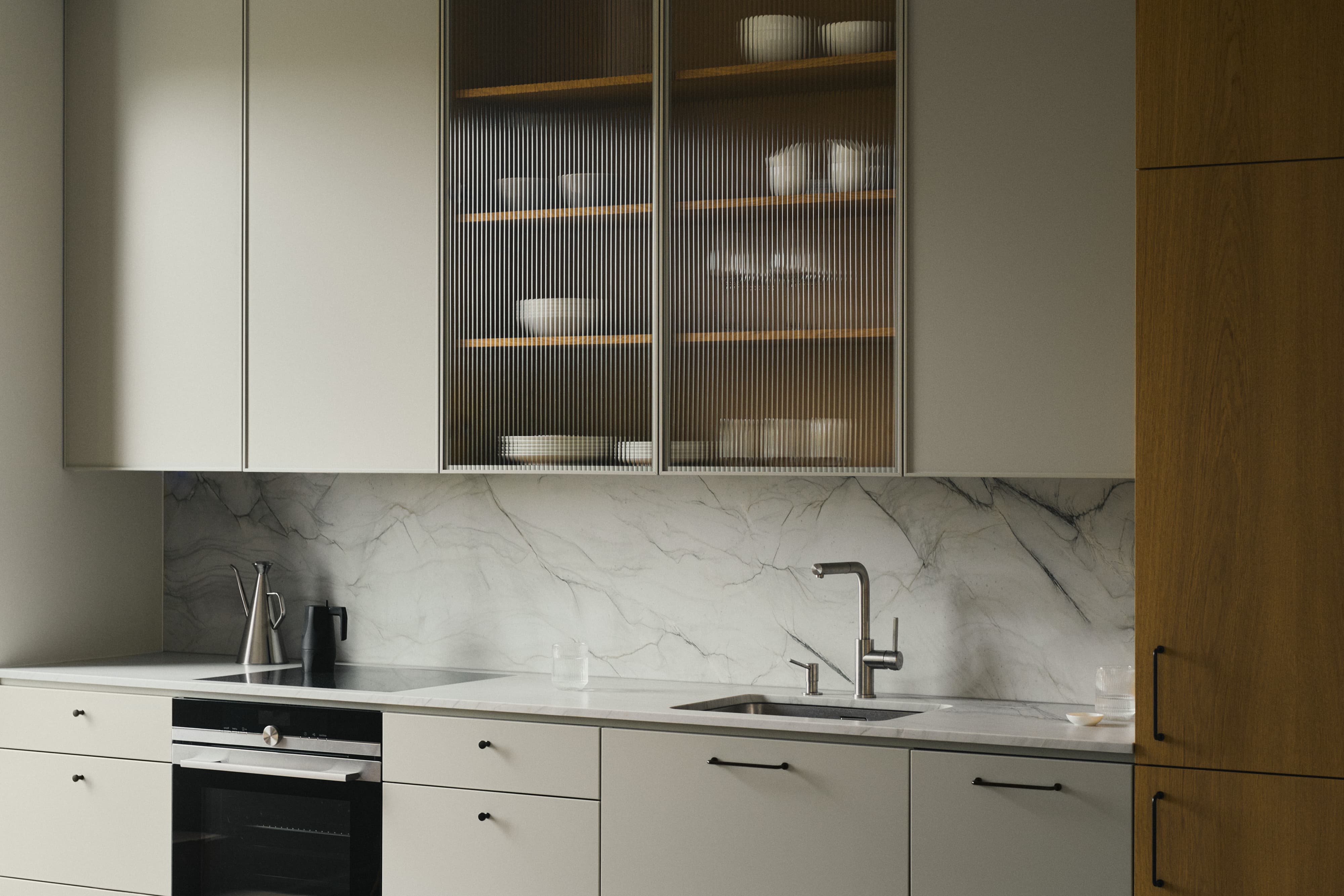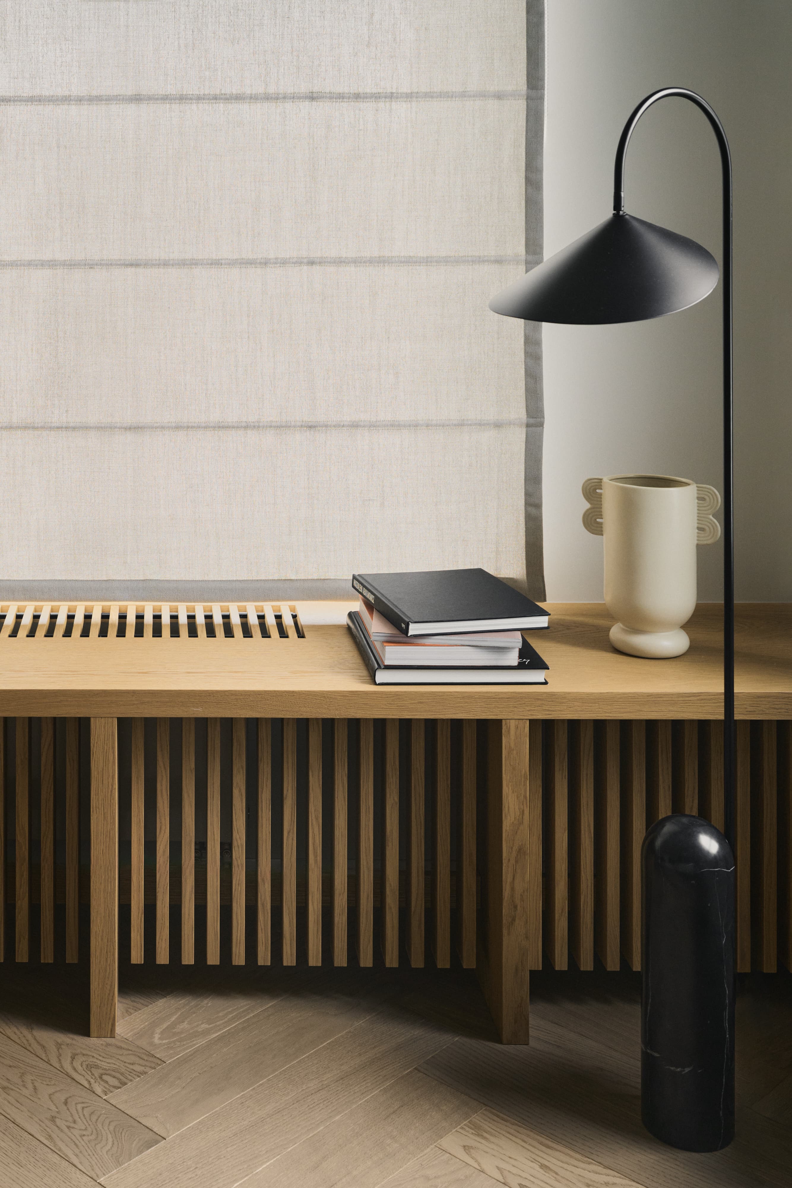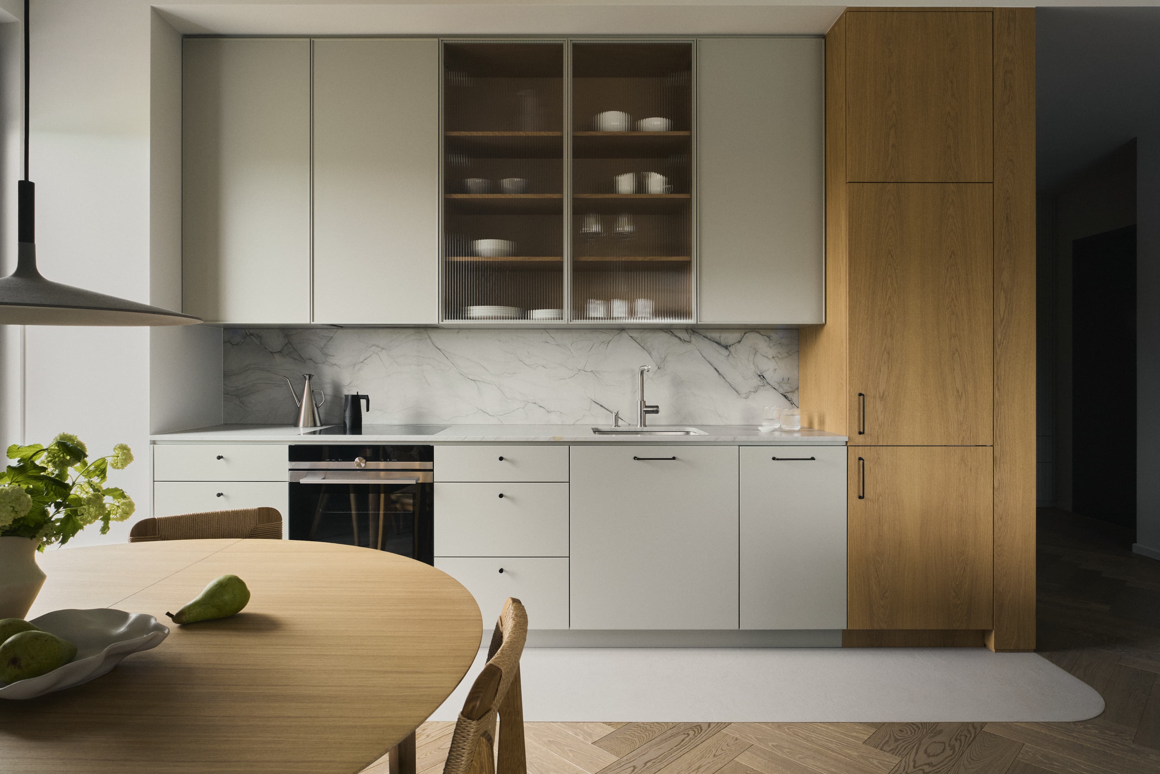 Wnętrze jest utrzymane w bardzo monochromatycznej gamie. Prostotę podkreślają starannie dobrane meble. Krzesła Gubi z plecionym siedziskiem czy minimalistyczna lampa Foscarini nad stołem. Wszystkie wykorzystane materiały i okładziny są naturalne, matowe i skromne w wyrazie. Całość stanowi niezwykle spójną przestrzeń .Głównym i najbardziej reprezentacyjnym pomieszczeniem jest salon. Jego atutem jest sporych rozmiarów okno. To dzięki niemu nawet w pochmurny dzień, a tych na Pomorzu zwłaszcza jesienią nie brakuje, pozostaje całkiem dobrze doświetlony. Podobnie jak i łącząca się z nim kuchnia, z której można wyjść na całkiem duży taras z widokiem. Są tu też dwie sypialnie i dwie łazienki.