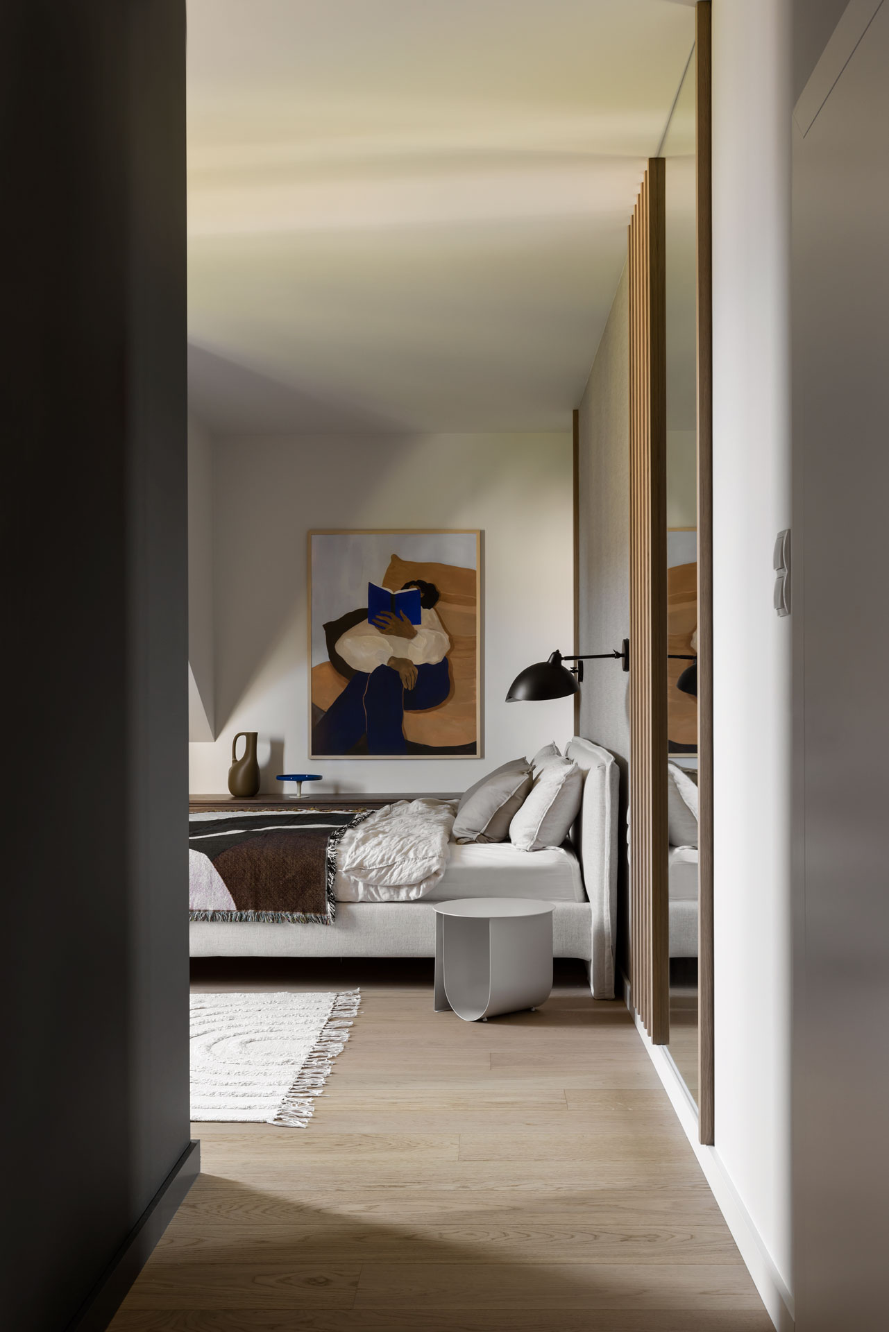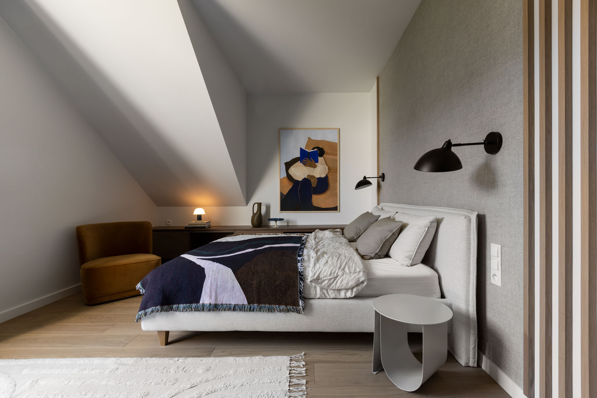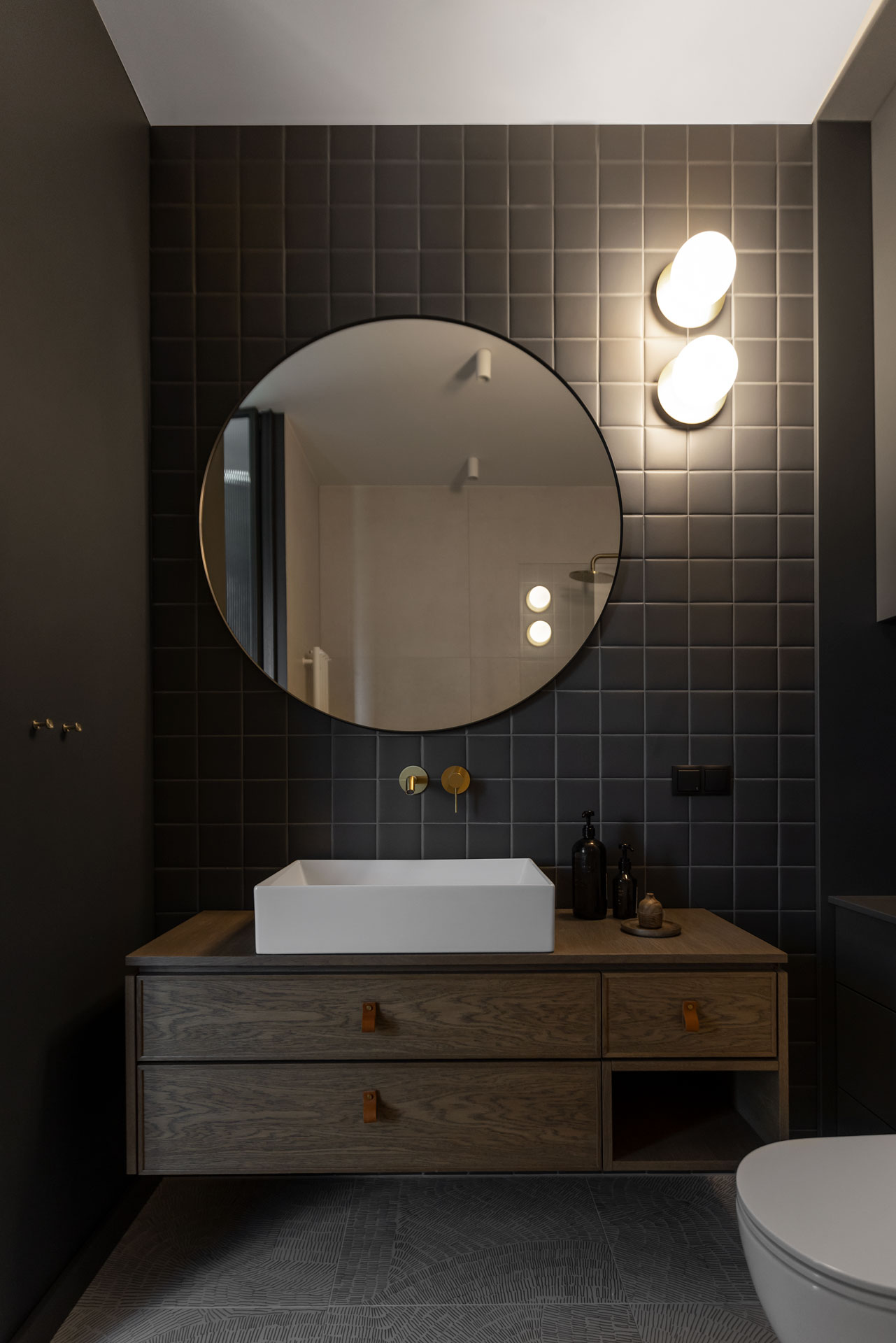 Zupełnie inna w charakterze jest część prywatna właścicieli. Jest to azyl i miejsce wyciszenia. Dominują tu ciemniejsze, głębsze tony, a wybarwienie drewna odbiega od reszty domu. Obok sypialni jest tu osobista łazienka i garderoba. Wszystkie utrzymane w jednym charakterze. Łazienkę stanowi ciemny kubik, a do wnętrza prowadzą drzwi z ryflowanego szkła. Są tu też ciemne kotary. W łazience pojawiają się ciemne płytki , które jakby pochłaniają światło i sprawiają wrażenie miękkich. Wszystkie te elementy mają łagodzić uciążliwą dla właścicieli zmianę strefy czasowej.