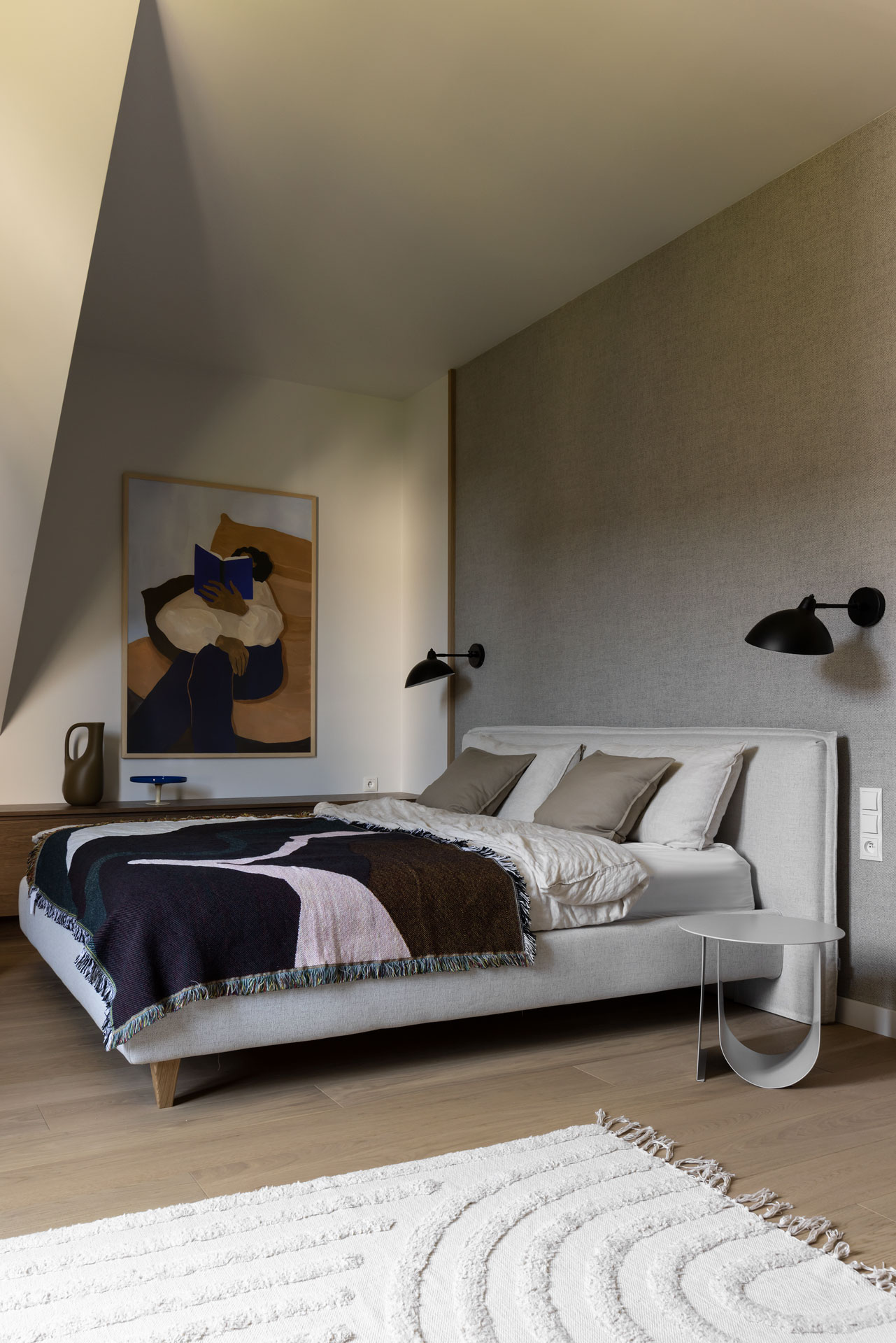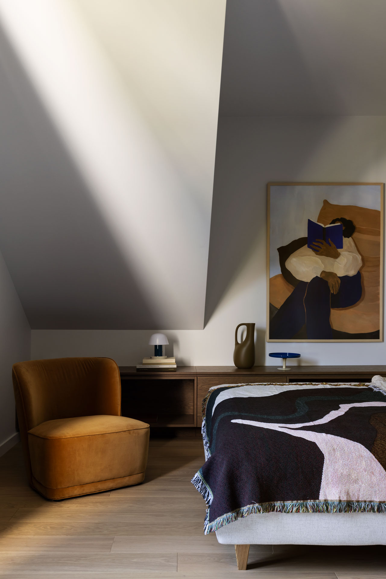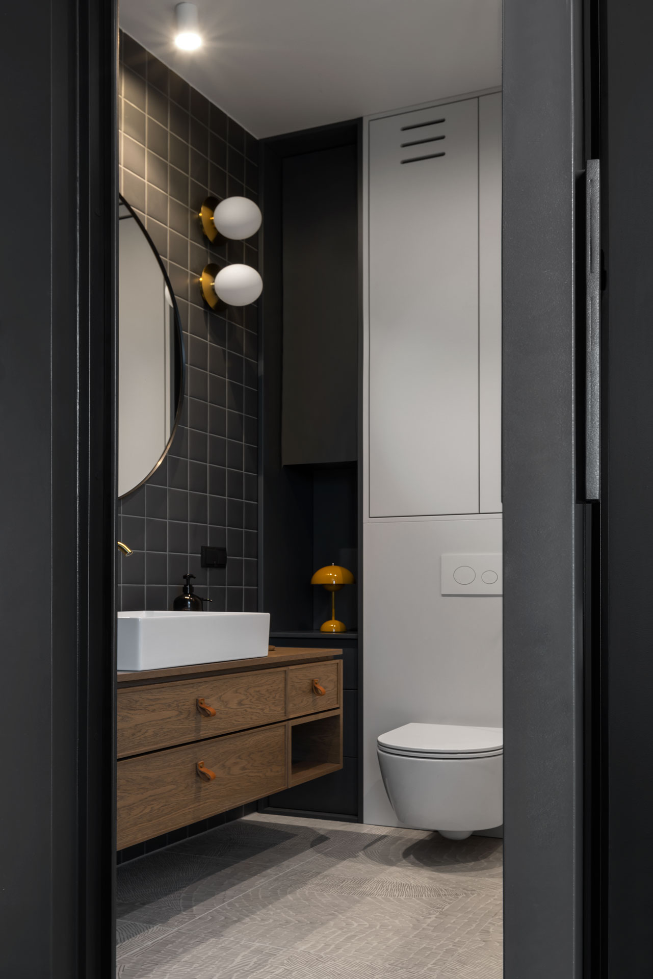 Zupełnie inna w charakterze jest część prywatna właścicieli. Jest to azyl i miejsce wyciszenia. Dominują tu ciemniejsze, głębsze tony, a wybarwienie drewna odbiega od reszty domu. Obok sypialni jest tu osobista łazienka i garderoba. Wszystkie utrzymane w jednym charakterze. Łazienkę stanowi ciemny kubik, a do wnętrza prowadzą drzwi z ryflowanego szkła. Są tu też ciemne kotary. W łazience pojawiają się ciemne płytki , które jakby pochłaniają światło i sprawiają wrażenie miękkich. Wszystkie te elementy mają łagodzić uciążliwą dla właścicieli zmianę strefy czasowej.