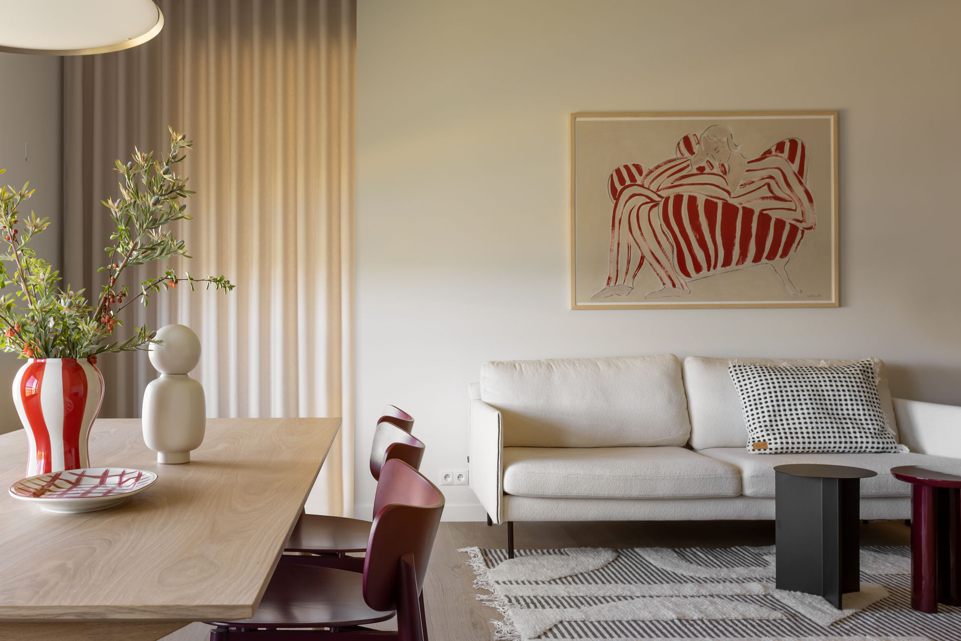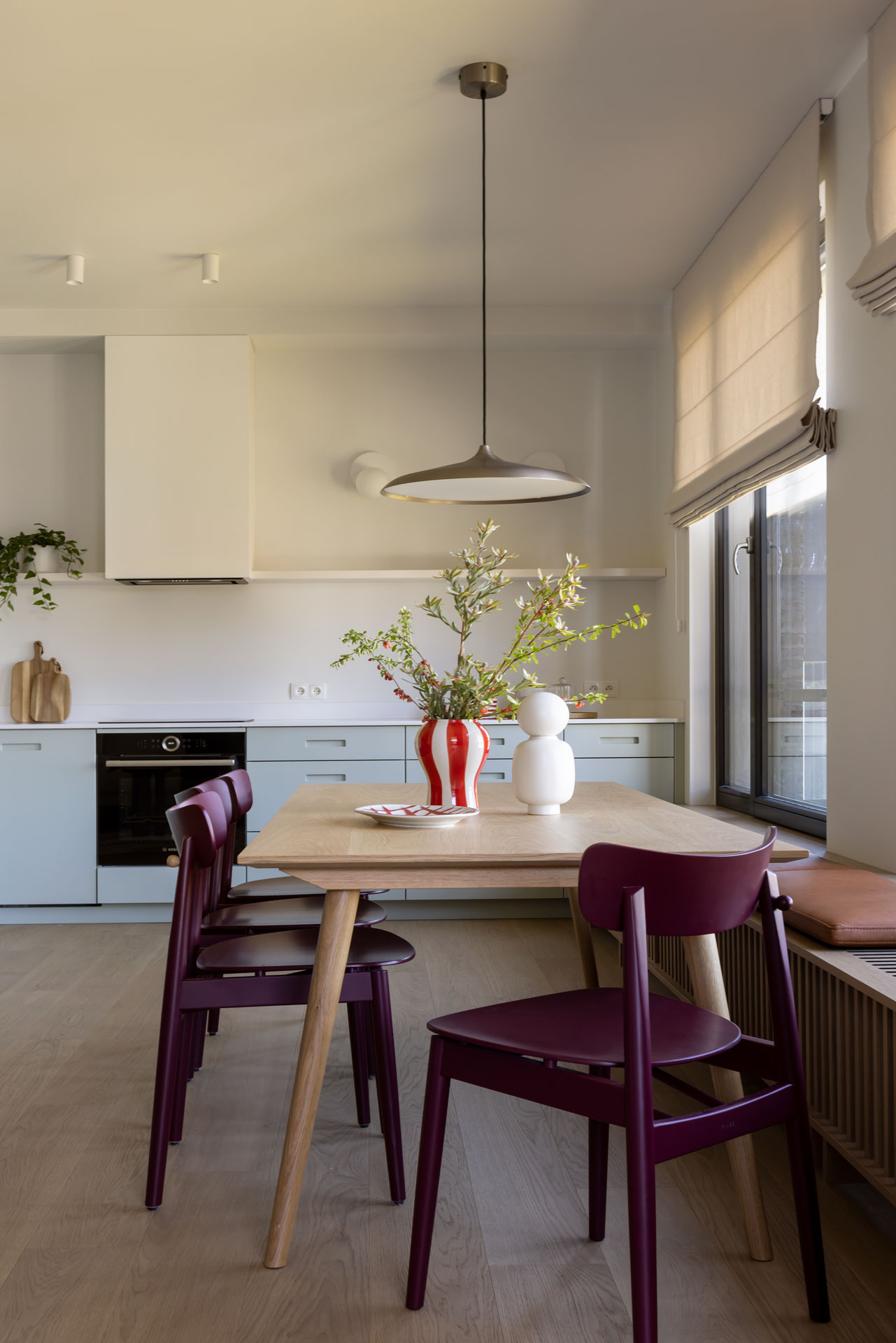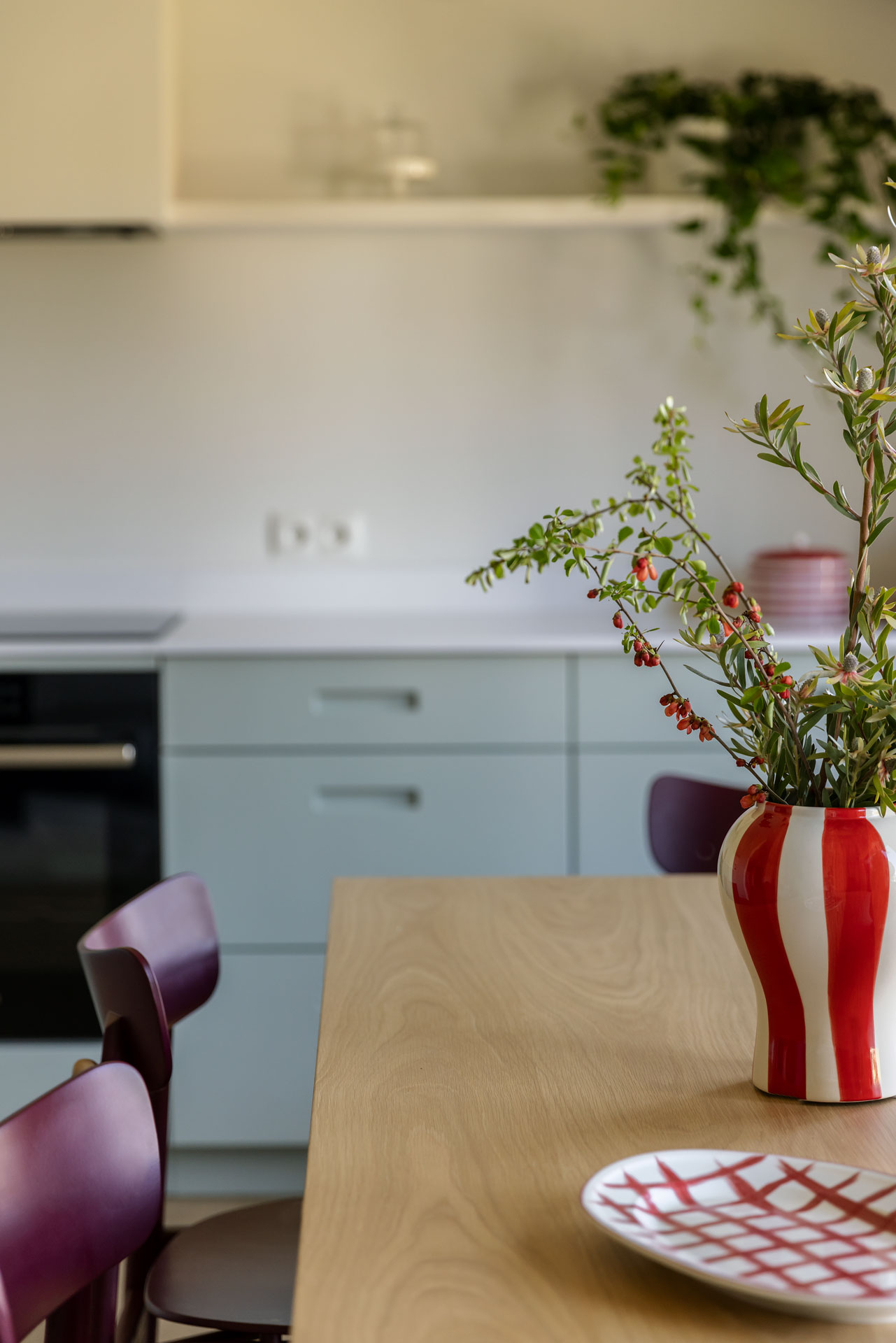 Apartament w Sopocie położony jest tuż przy plaży, a okolica tonie w zieleni. Właściciele, którzy na co dzień mieszkają za oceanem, nie mogli się oprzeć tej lokalizacji. Dzisiaj przyjeżdżają tu aby odpocząć. Ale nie tylko. Jest to miejsce licznych rodzinnych spotkań. Stąd naturalny podział przestrzeni na dwie strefy gościnną i prywatną. Część wspólna jest jasna , główną rolę gra widok za oknem. I to właśnie tutaj jest stół – punkt wszystkich spotkań. Tło dla mocnych kolorystycznych akcentów stanowi jasna zieleń. Łazienka gościnna jest utrzymana w tej samej tonacji.