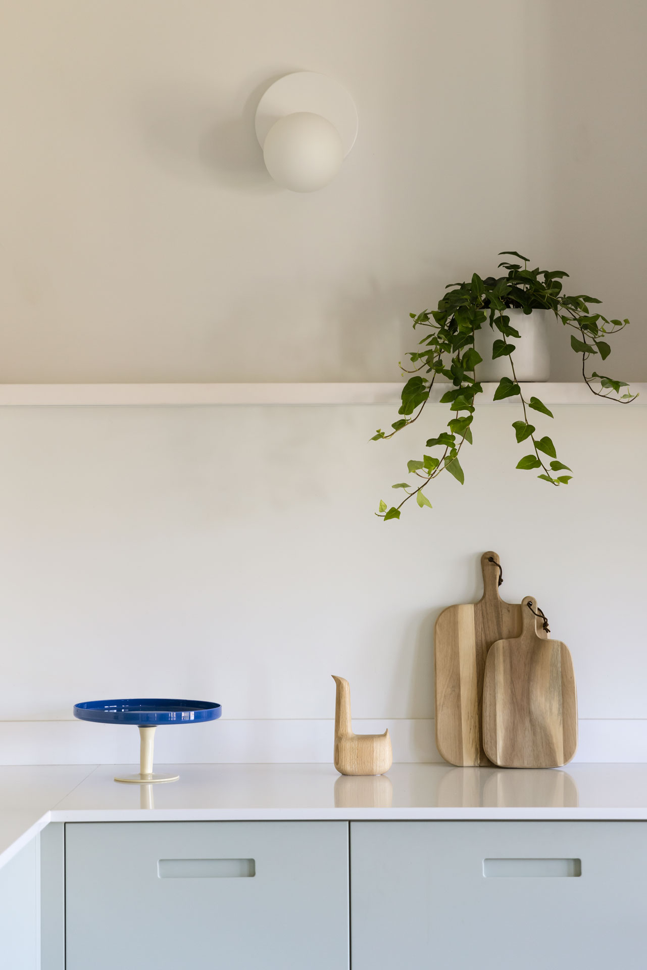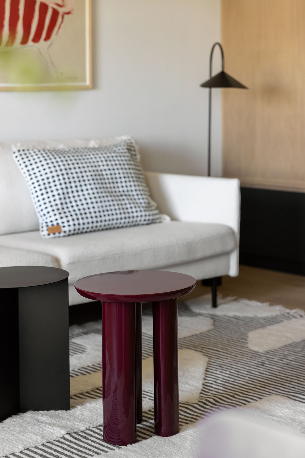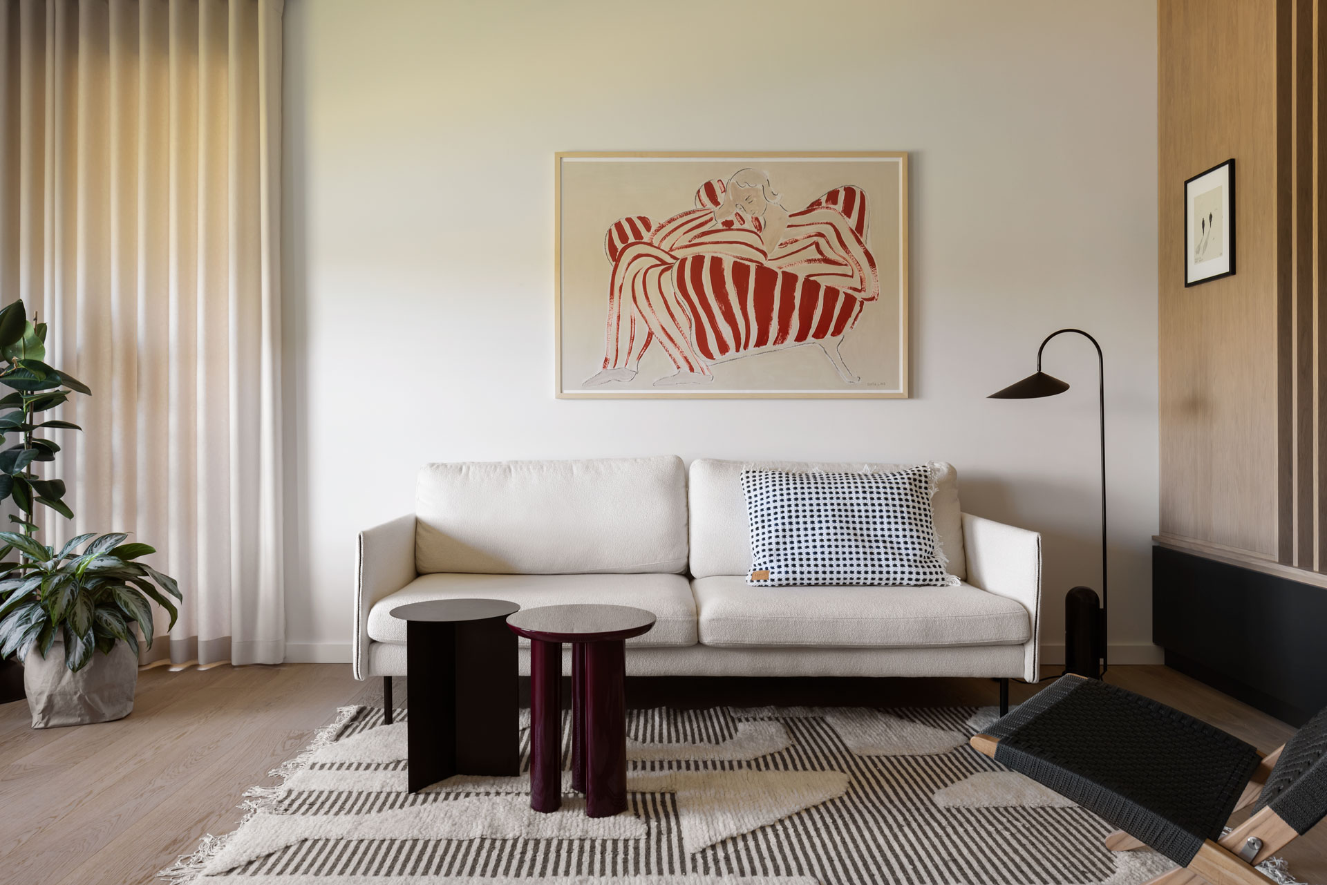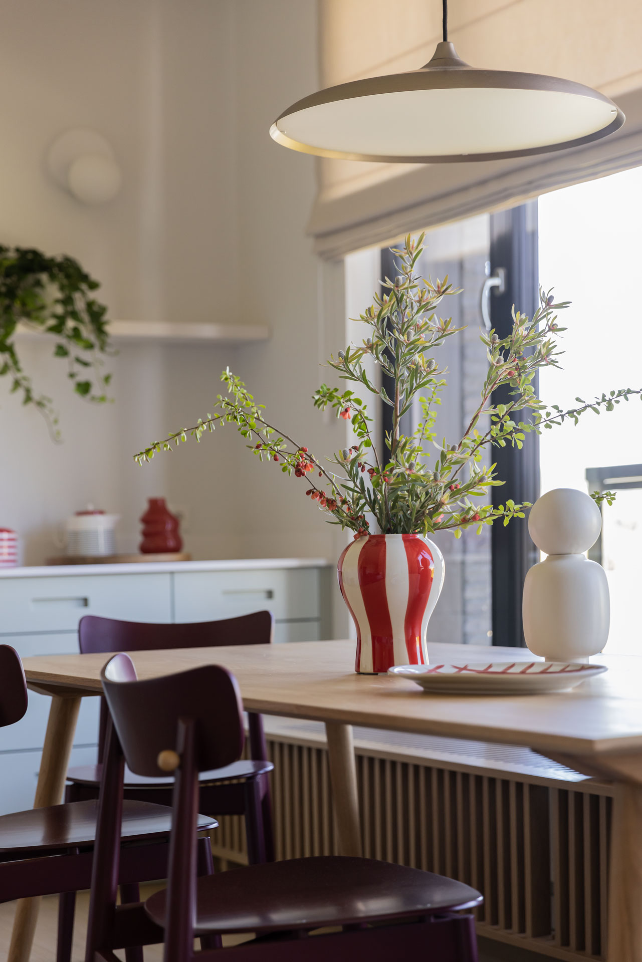 Apartament w Sopocie położony jest tuż przy plaży, a okolica tonie w zieleni. Właściciele, którzy na co dzień mieszkają za oceanem, nie mogli się oprzeć tej lokalizacji. Dzisiaj przyjeżdżają tu aby odpocząć. Ale nie tylko. Jest to miejsce licznych rodzinnych spotkań. Stąd naturalny podział przestrzeni na dwie strefy gościnną i prywatną. Część wspólna jest jasna , główną rolę gra widok za oknem. I to właśnie tutaj jest stół – punkt wszystkich spotkań. Tło dla mocnych kolorystycznych akcentów stanowi jasna zieleń. Łazienka gościnna jest utrzymana w tej samej tonacji.